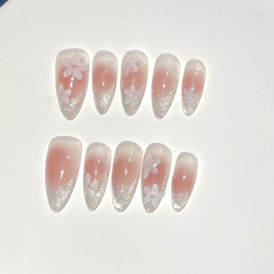 White Flower Pink Almond Nail Handmade Press On Nails