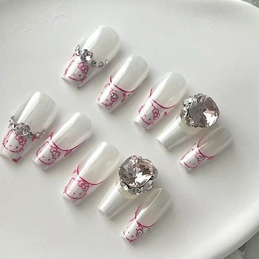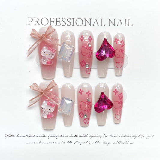Hellokitty Pink Nail Bow Heart Big Diamonds Handmade Press On Nail