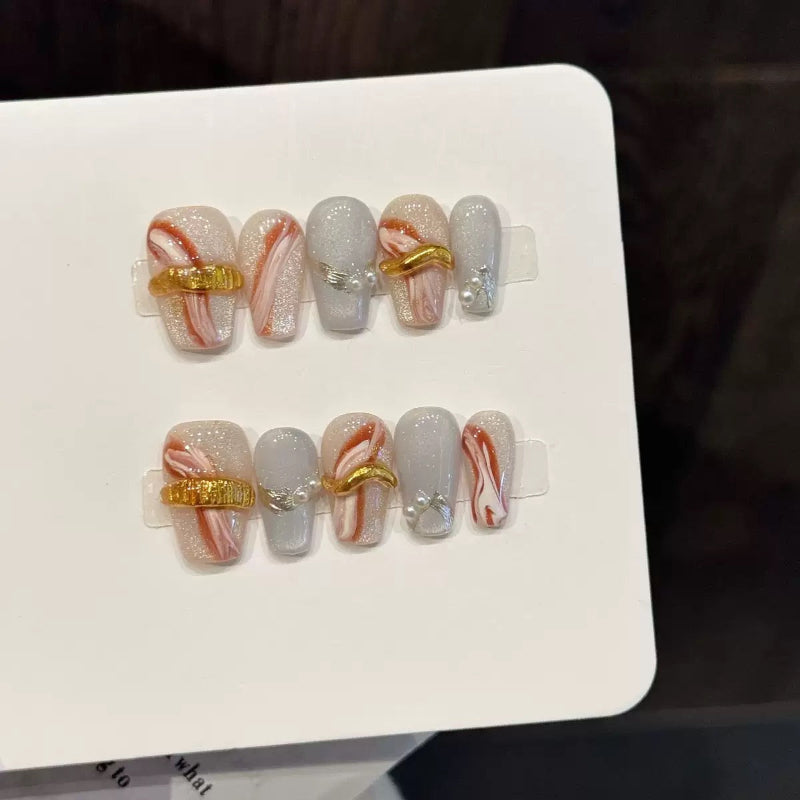 Each set has 10 pcs of Press-on nails and a Free application kit(Nail glue, Sticky tab, Nail file, and cuticle pusher).
