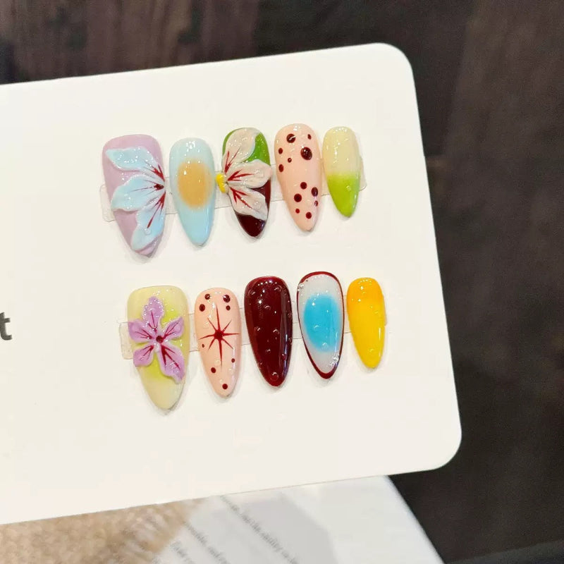 Each set has 10 pcs of Press-on nails and a Free application kit(Nail glue, Sticky tab, Nail file, and cuticle pusher).